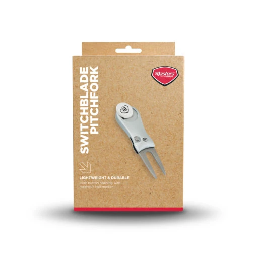 Switchblade Style Pitchfork Designed for the golfer that needs a compact and durable tool. The ïswitchblade style pitchfork springs out with the press of a button, and folds back into the handle. It also features a detachable ball marker.