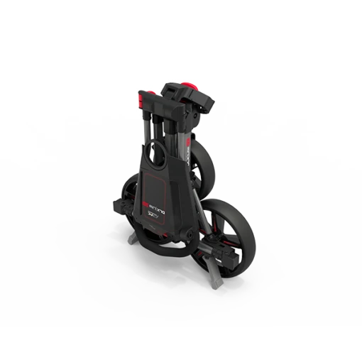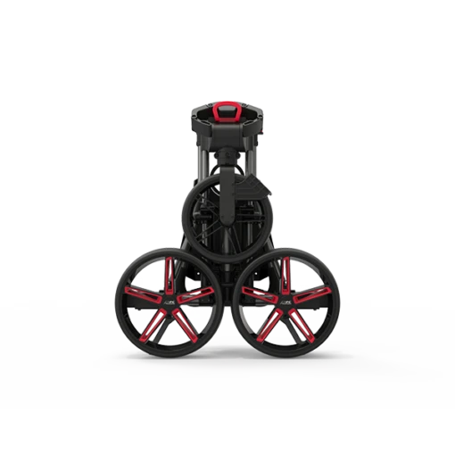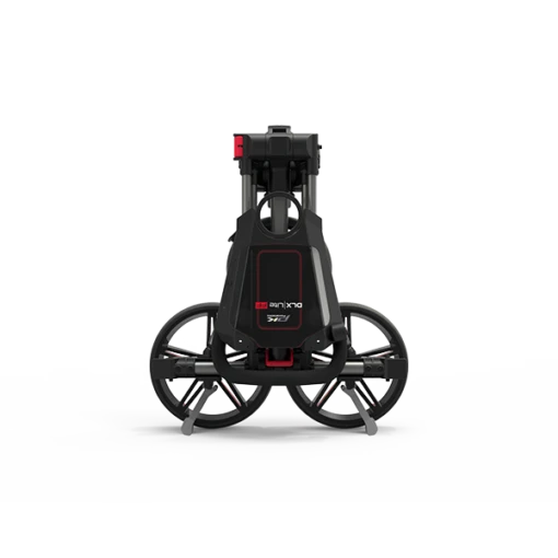 Featuring a large scorecard holder, drinks holder, umbrella holder base, storage compartment, ball holder, tee holder and parking brakes on both wheels to secure the trolley in place when not in use.